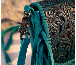 Leather Tooled Fringe Vintage Pattern Crossbody - Deep Blue